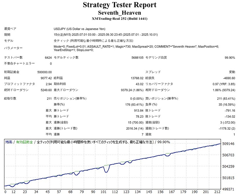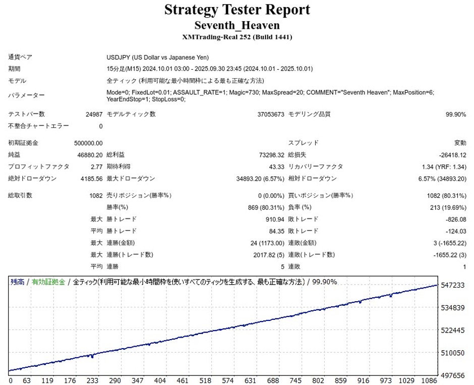 セブンス・ヘブンではデフォルトは複利運用モードになっています。検証では、固定ロットモードでバックステストを行っています。