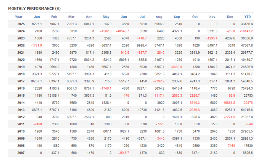 一番右側(YTD)の年次成績はマイナスになったのは2011年、2014年、2024年で他はプラスでした。