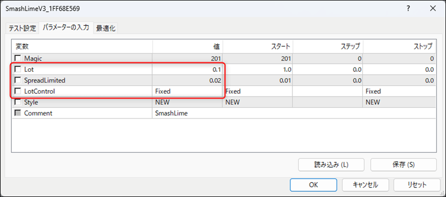 検証では、「Fixedモード」0.1ロット固定、スプレッド上限を0.02でバックテストを行っています。