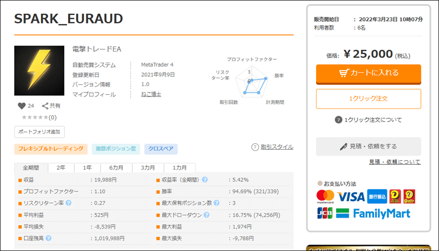 | プロフィットファクター | 1.10 | 勝率 | 94.69% (321/339) |