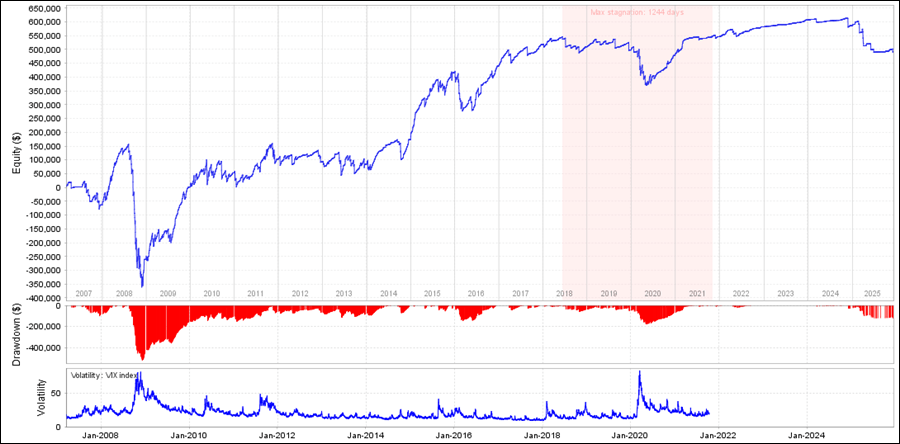 SPARK_EURAUDをQuantAnalyzerで見てみると、2008年のドローダウンが大きく、2009年からも利益はあがっていますが、停滞期間が長くなっています。