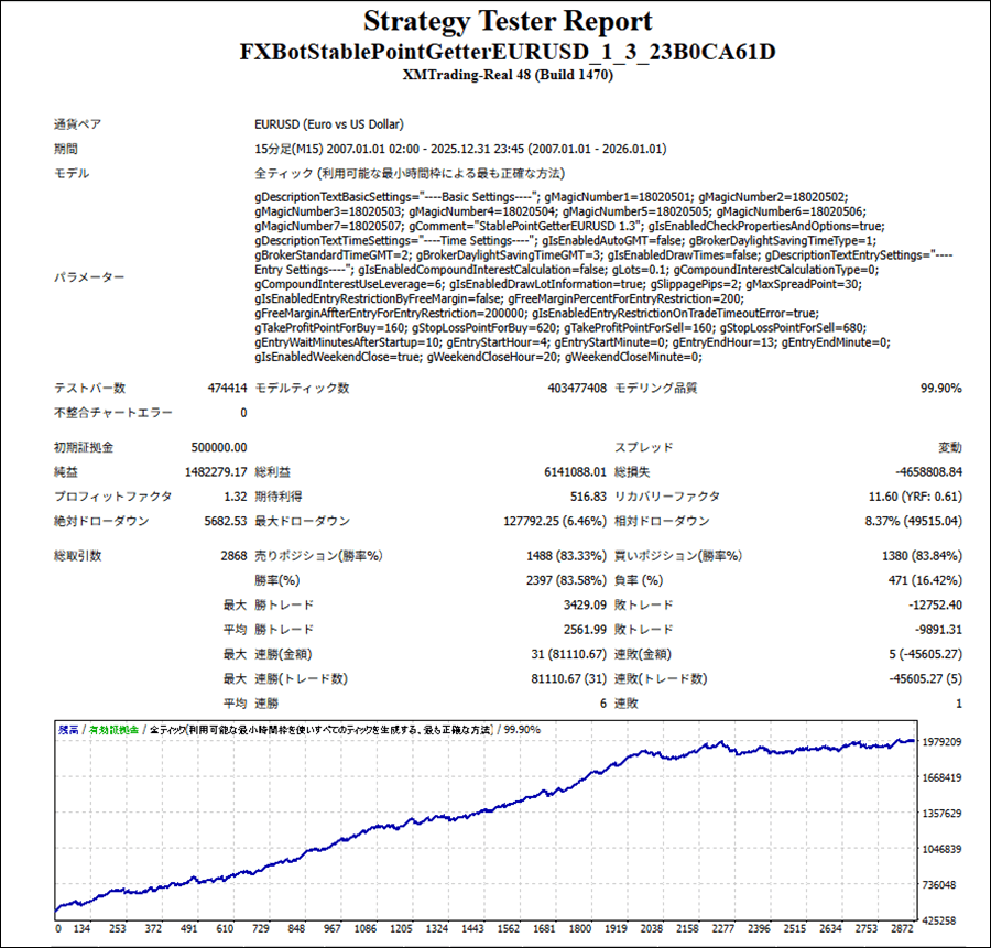 StablePointGetterEURUSDのリリース後のバックテスト結果(≒フォワード結果)は以下のようになりました。