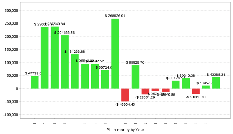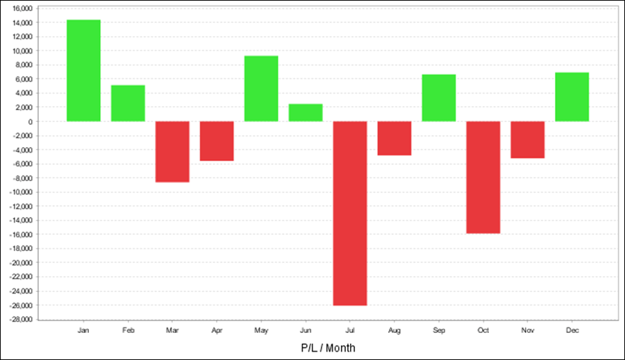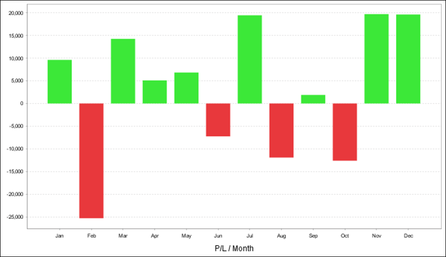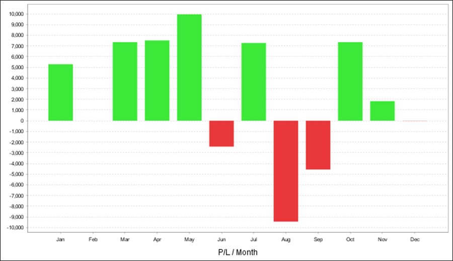 QuantAnalyzerを使った年次・月次の成績となります。前半はプラスが大きいですが、後半は利益率が低くなっています。
