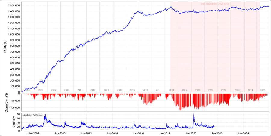 StablePointGetterEURUSDをQuantAnalyzerで見てみると、前半は順調に成績があがっていましたが、2018年以降少し停滞しています。