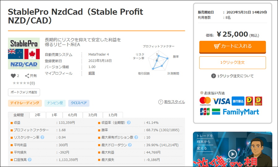 StablePro NzdCad(Stable Profit NZD/CAD)はNZDCAD専用のリピート系EAですが、成績はどうなのでしょうか。