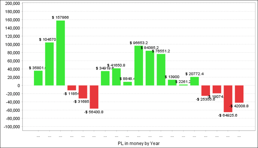 QuantAnalyzerを使った年次成績となります。直近でマイナスが多くなっています。