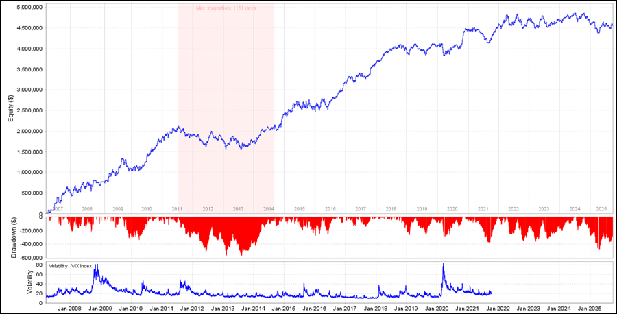 Swing_Max_EURAUDをQuantAnalyzerで見てみると、2012年~2014年は停滞していますが全体的に右肩上がりで推移しています。