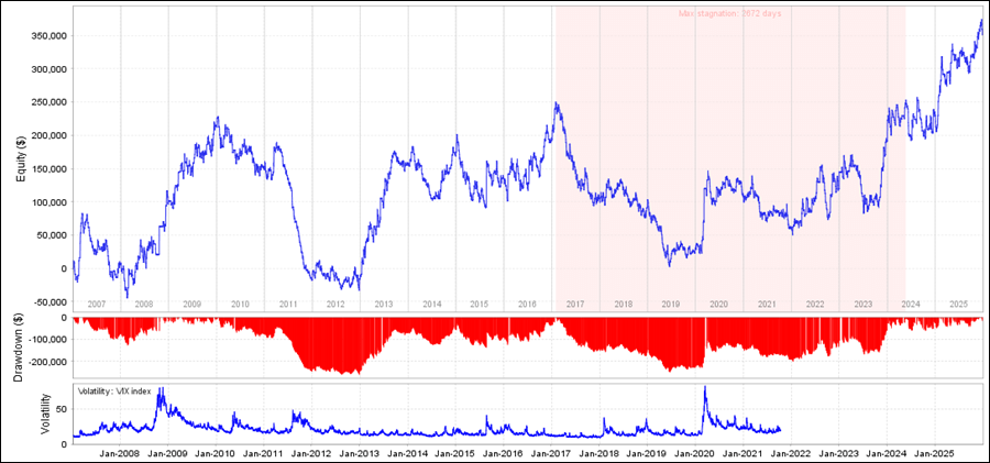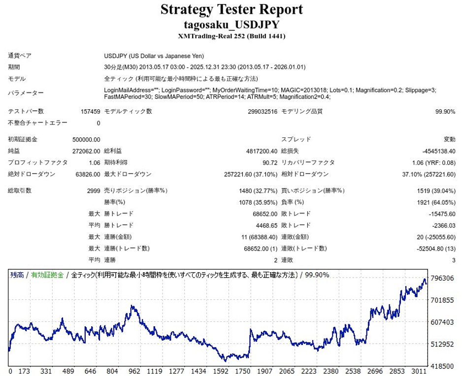 tagosaku USDJPYをQuantAnalyzerで見てみると、長期ではかなりアップダウンが激しいです。
