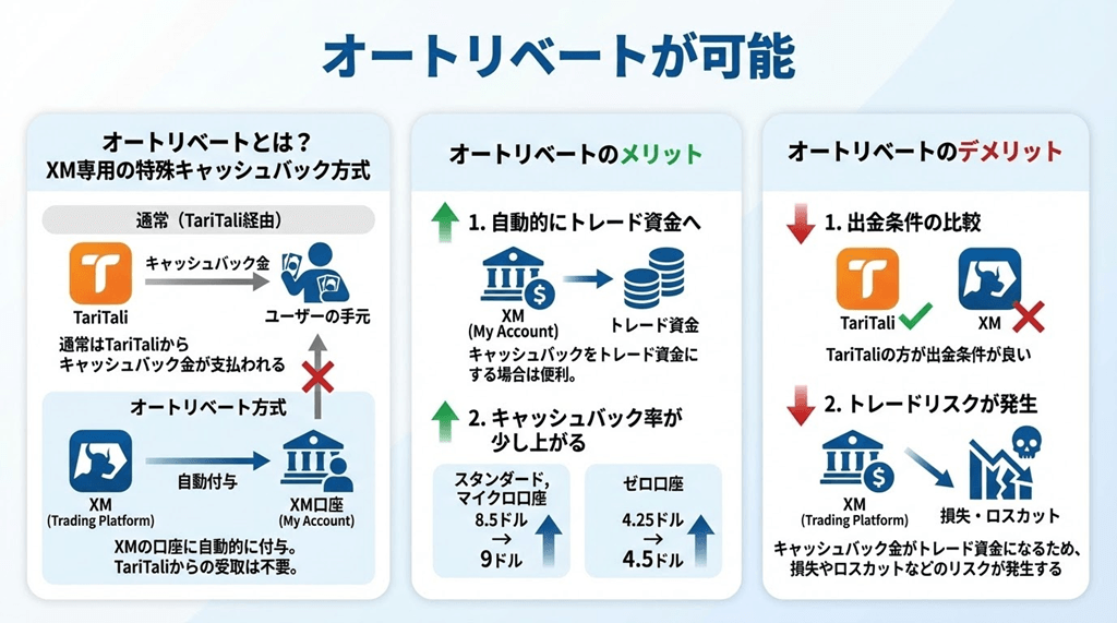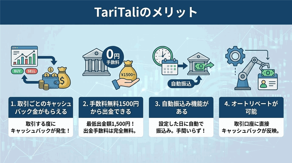 オートリベートはメリット・デメリットがありますが、TariTaliのキャッシュバック金をトレード資金にしている人は、オートリベートを使うと便利です。