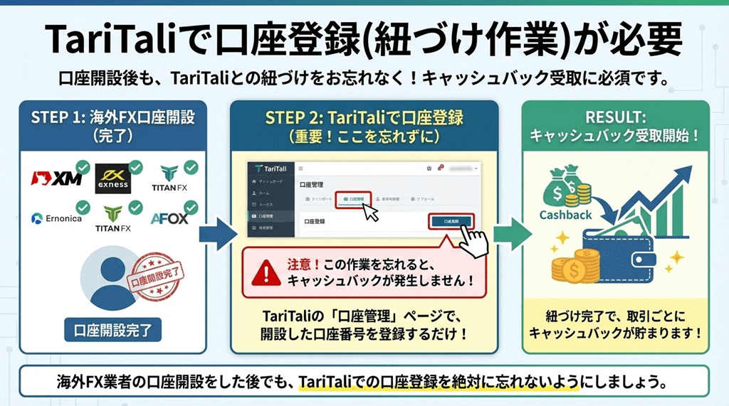 TariTali経由で海外FX業者に登録した後も、「口座登録」というTariTaliと業者の紐づけ作業が必要になります。