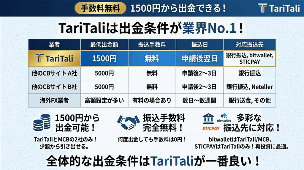 手数料無料のキャッシュバックサイトは多いですが、1,500円から出金可能なのはTariTaliとMCBの2社になります。