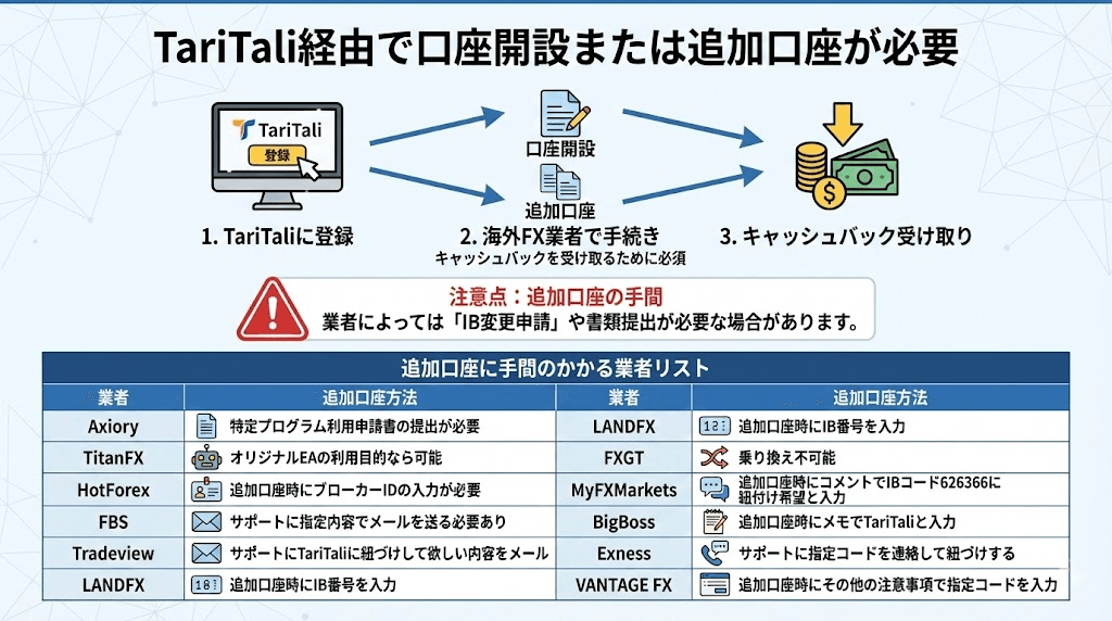 TariTaliでキャッシュバックを受け取るためには、TariTaliに登録後、キャッシュバックしたい海外FX業者に口座開設または追加口座をする必要があります。