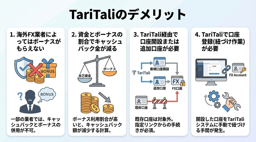 TariTaliは取引回数が多い人や大きいロットで取引する人におすすめですが、一部の業者でボーナスがもらえなくなるなどのデメリットがあります。