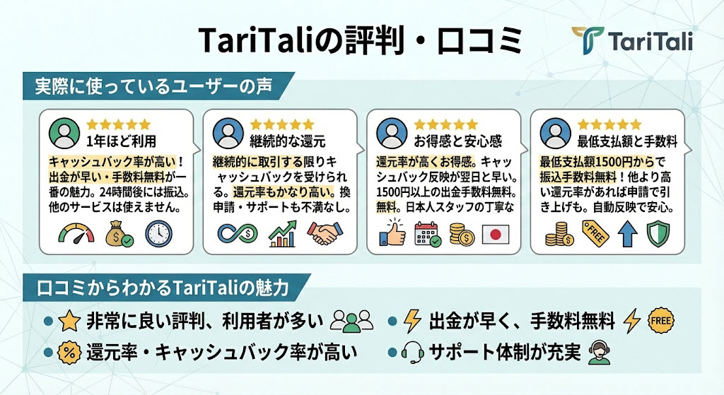 1年ほどTariTaliを利用しています。キャッシュバック率が高いのも魅力だとは思いますが一番の魅力は手数料無料な上に、早い出金だと個人的に思いました。