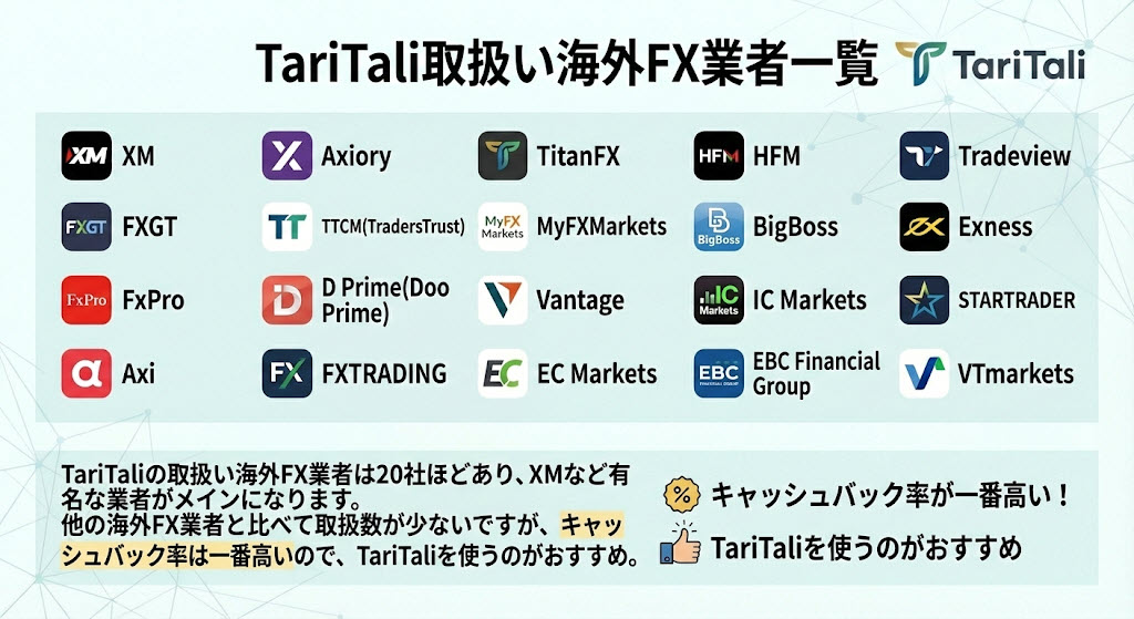 TariTaliの取扱い海外FX業者は20社ほどあり、XMなど有名な業者がメインになります。