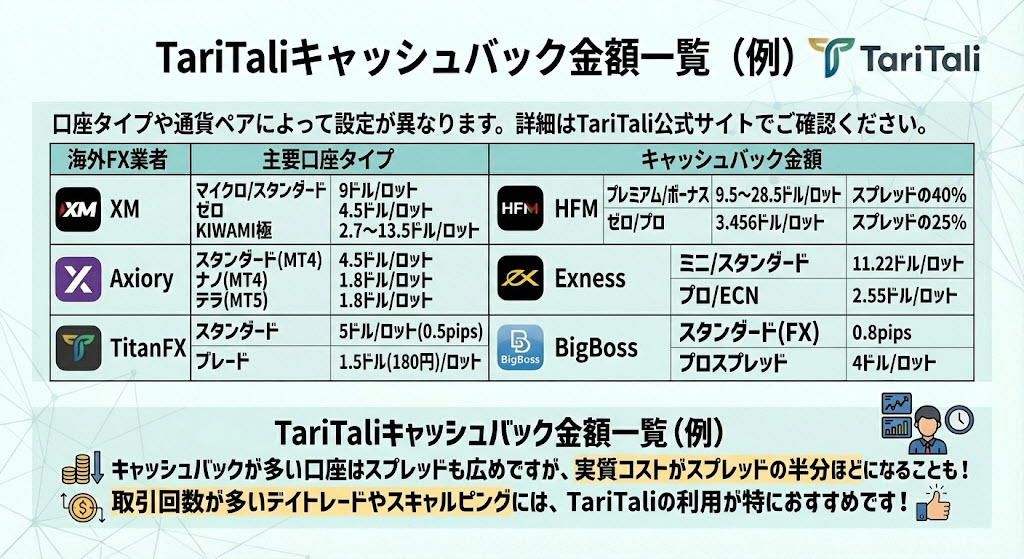 TariTaliは取引ごとにキャッシュバック金額が、最大でスプレッドの半分ほど返ってくるのでおすすめです。
