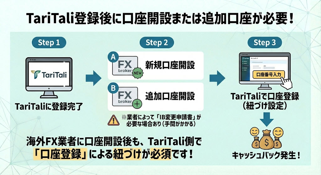 また、海外FX業者に口座開設後もTariTaliに「口座登録」をして、キャッシュバックの紐づけ設定が必要になります。