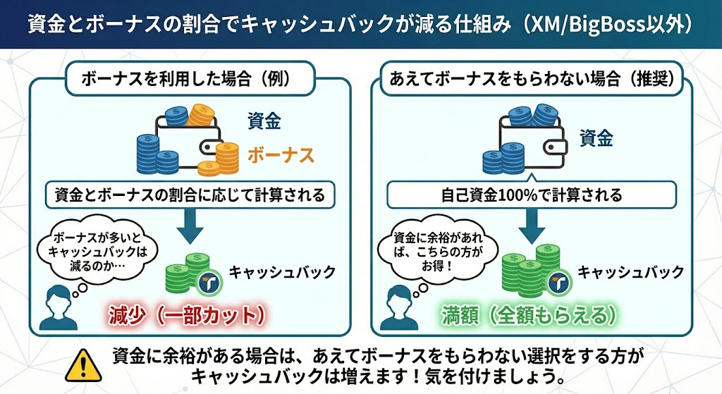 資金とボーナスの割合でキャッシュバック金額が減る