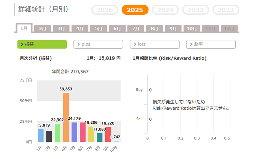 2022年~2025年の月間成績をまとめると合計で+1.4万円の成績となりました。取引のない月も多いです。