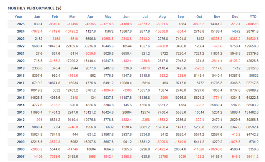年単位では2007年と2023年、2025年以外は全てプラスの成績です。