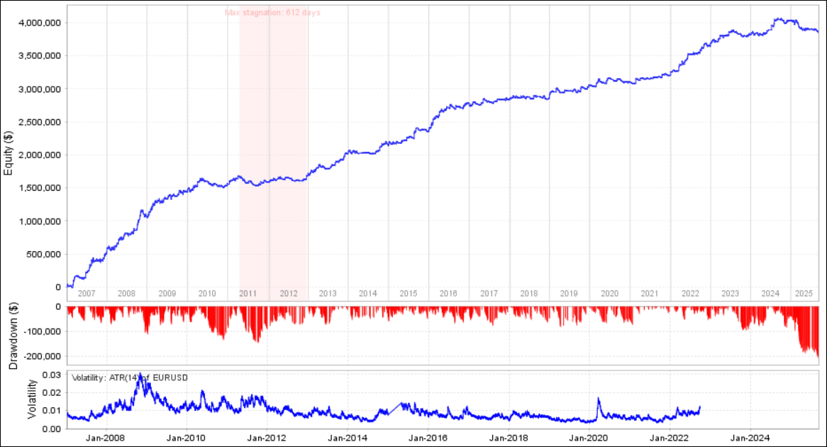 - 下方の赤色のグラフ:ドローダウン(山が大きいとドローダウンが大きい)