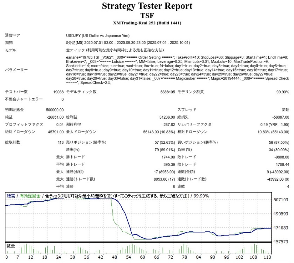変動スプレッドON、スリッページONにして、できるだけリアルに近い環境でテストしています。