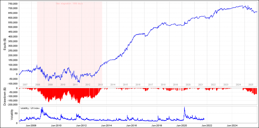 Tulamben_EURUSDをQuantAnalyzerで見てみると、前半は停滞していますが後半からは順調に利益を積み上げています。