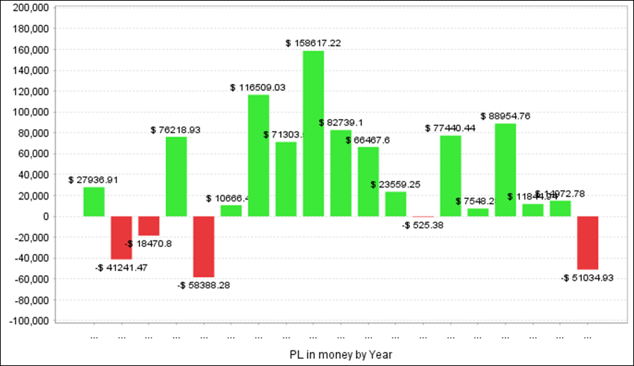 QuantAnalyzerを使った年次・月次の成績となります。直近はプラス成績の年が多くなっています。