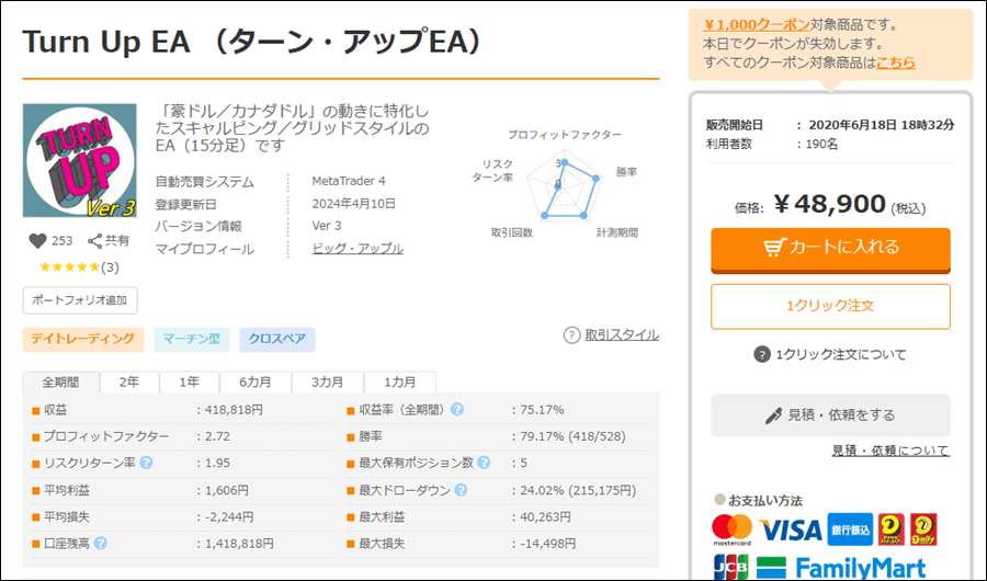 | 平均利益 | 378円 | 最大利益 | 6,579円 |