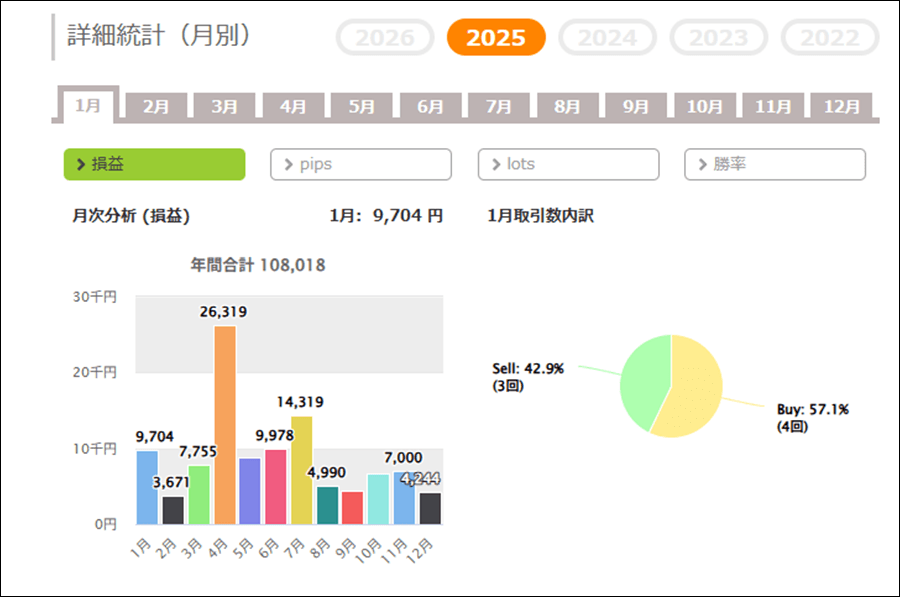 月次分析を見ると、2025年、2024年、2023年は安定して利益をあげています。