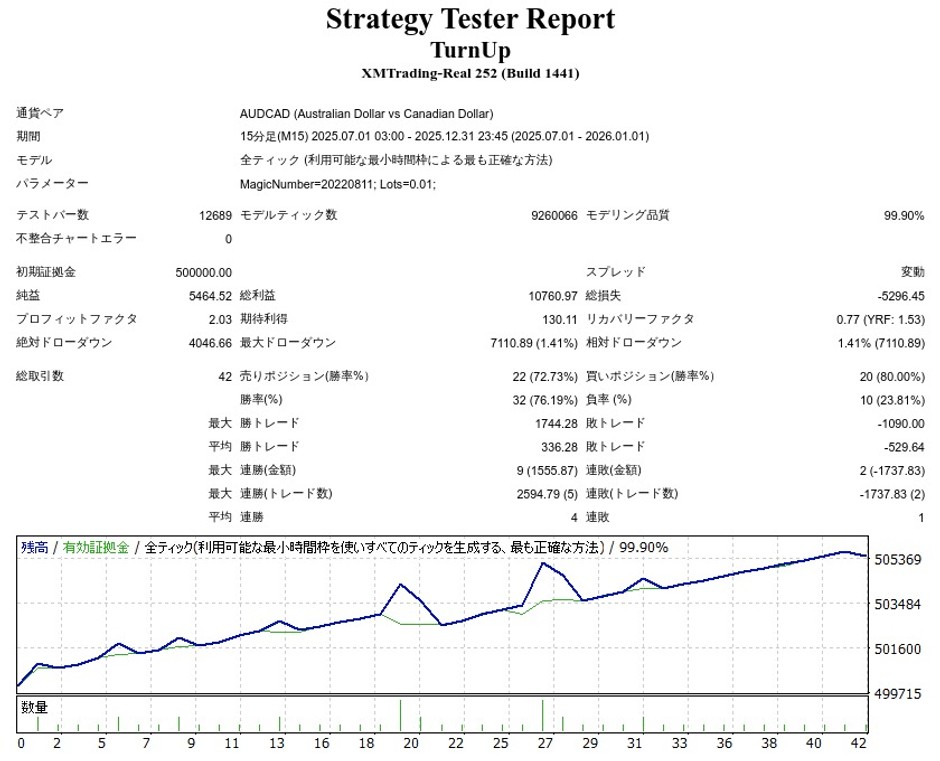 Turn Up EA (ターン・アップEA)のリリース後のバックテスト結果(≒フォワード結果)は以下のようになりました。