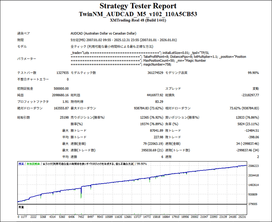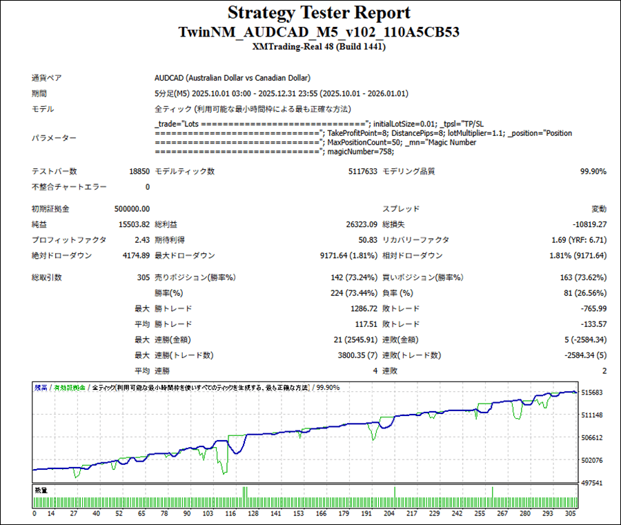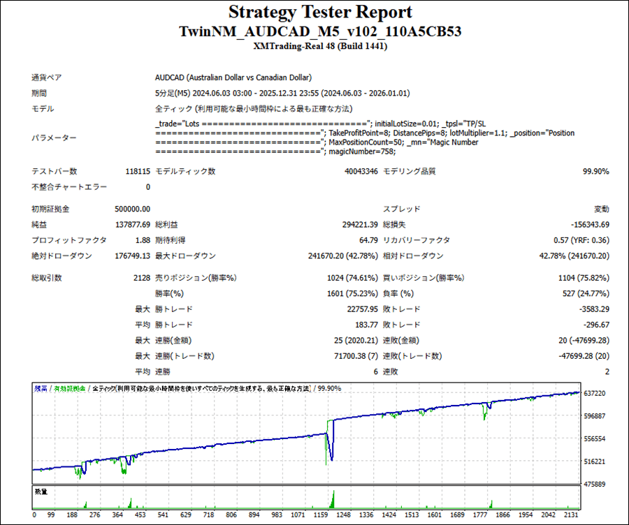 TwinNM AUDCADのリリース後のバックテスト結果(≒フォワード結果)は以下のようになりました。