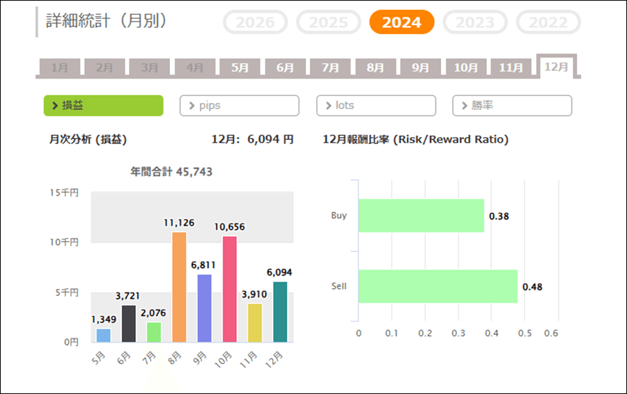| 平均利益 | 178円 | 最大利益 | 20,490円 |