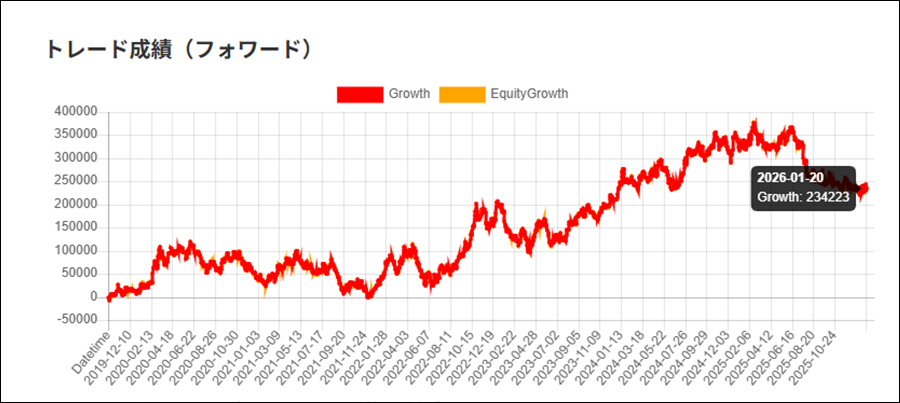 「バックテスト結果とフォワードテスト結果が違いないか」、「過去データに最適化し過ぎていないか」など参考にしてください。