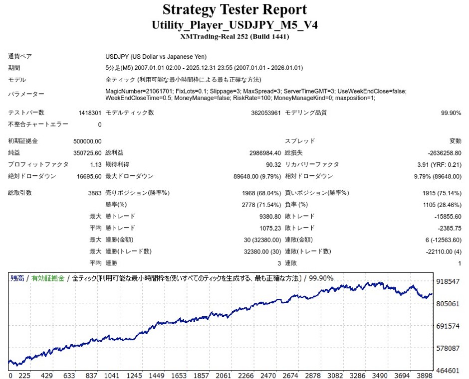 ユーティリティ・プレーヤーは順番り+逆張りを併せ持つUSDJPY専用のスキャルピングEAで、保有ポジションは1ずつ(買い×1、売り×1)となっています。