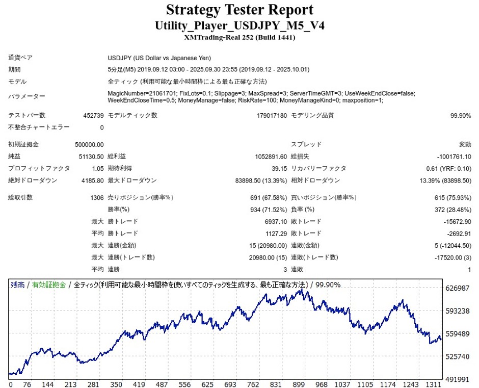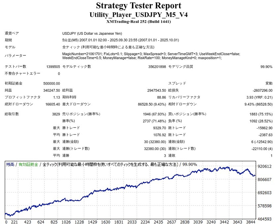 ユーティリティ・プレーヤーは順番り+逆張りを併せ持つUSDJPY専用のスキャルピングEAで、保有ポジションは1ずつ(買い×1、売り×1)となっています。
