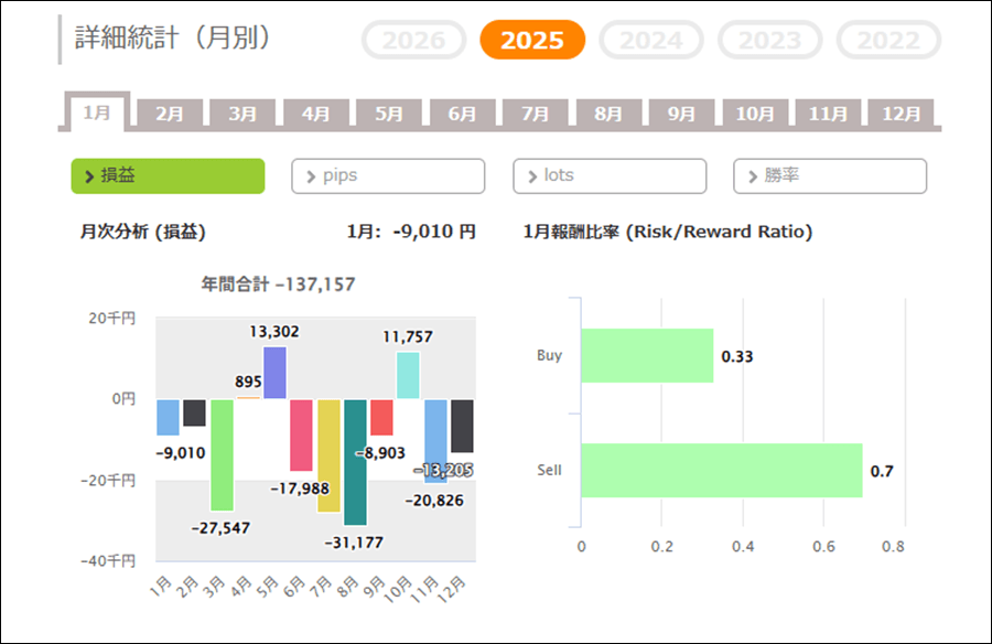 月次分析を見ると、2025年は今のところトータルでマイナスです。2024年は勝ったり負けたりです。