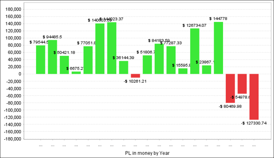 QuantAnalyzerを使って3通貨ペアを合計すると、過去18年間で+88万円の収益となりました。