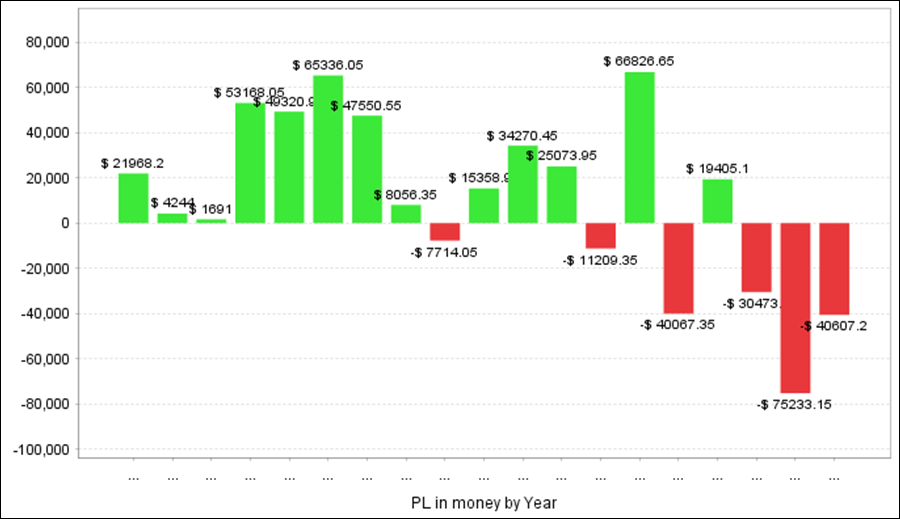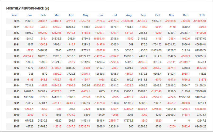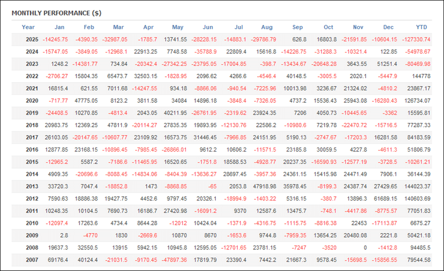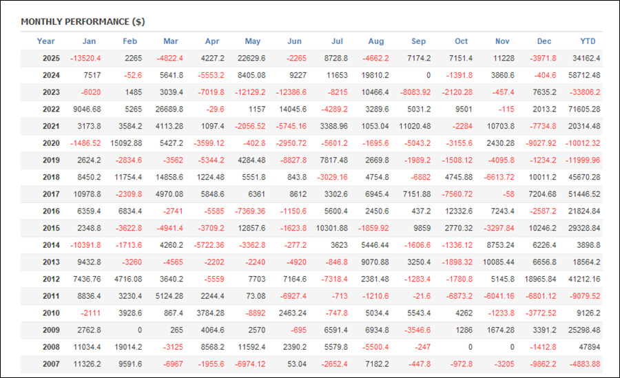 合計の年次成績では2015年、2023年、2024年、2025年以外は全てプラスとなっています。