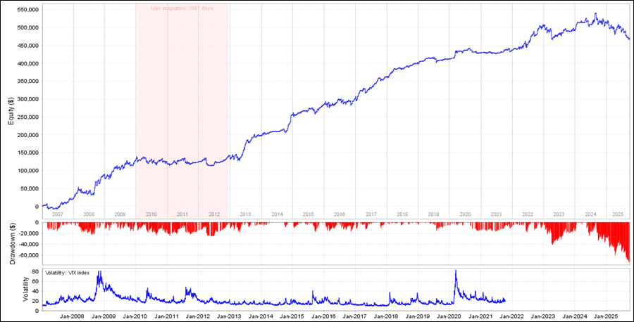 X ドル円をQuantAnalyzerで見てみると、全体的に右肩上がりのチャートですが、2009年~2013年は停滞しています。