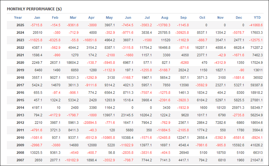 一番右側(YTD)の年次成績では2010年と2023年はマイナスでそれ以外はプラスの成績でした。