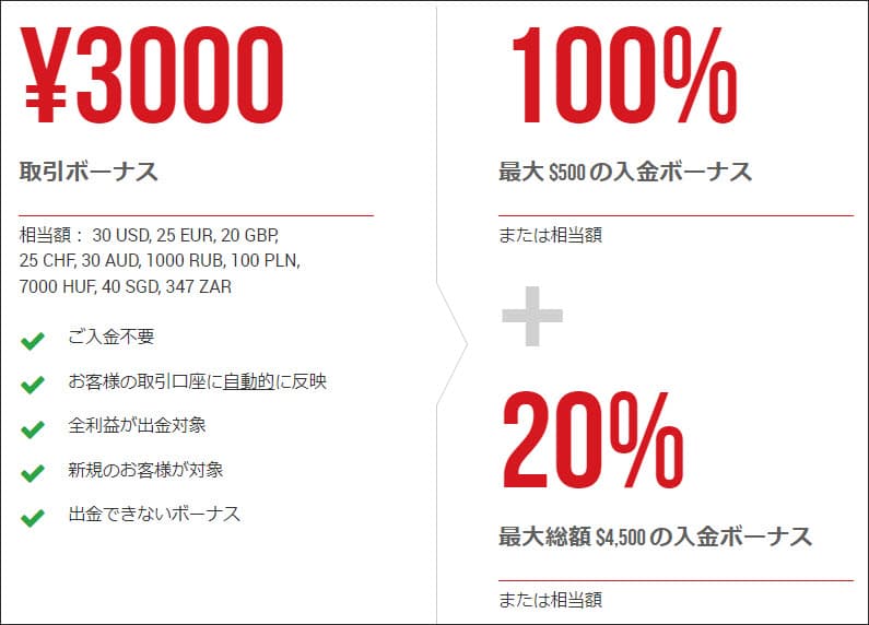 | 口座開設ボーナス | 100%入金ボーナス | 20%入金ボーナス | |