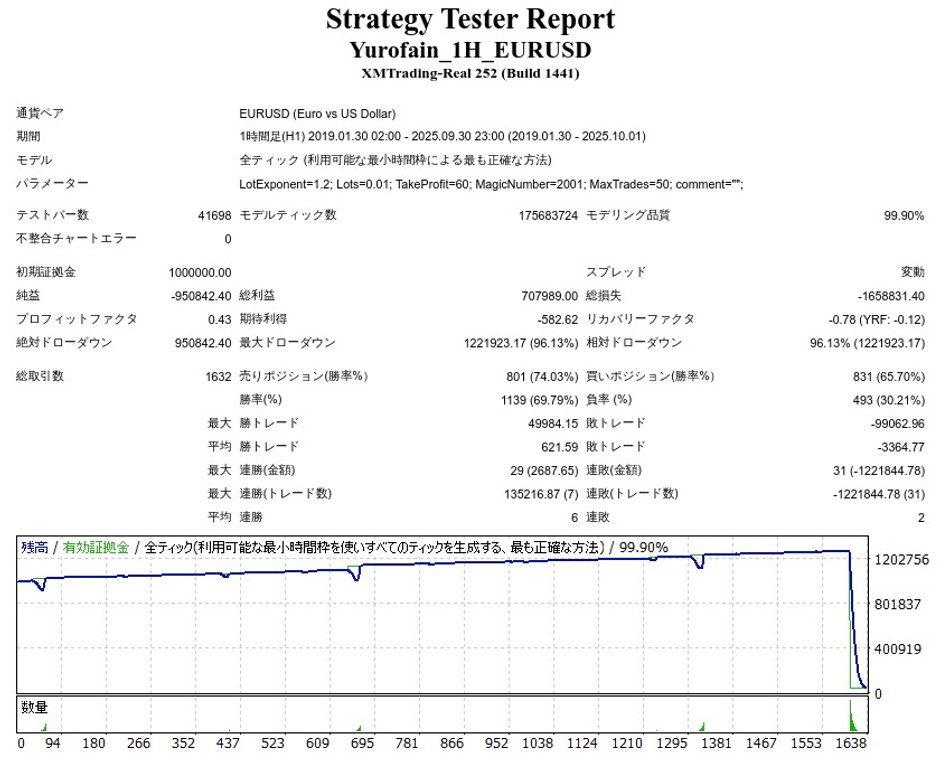 | 初期証拠金 | 1,000,000円 | 勝率 | 69.79% |