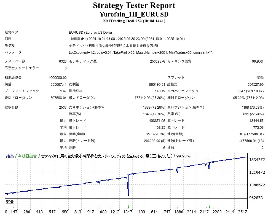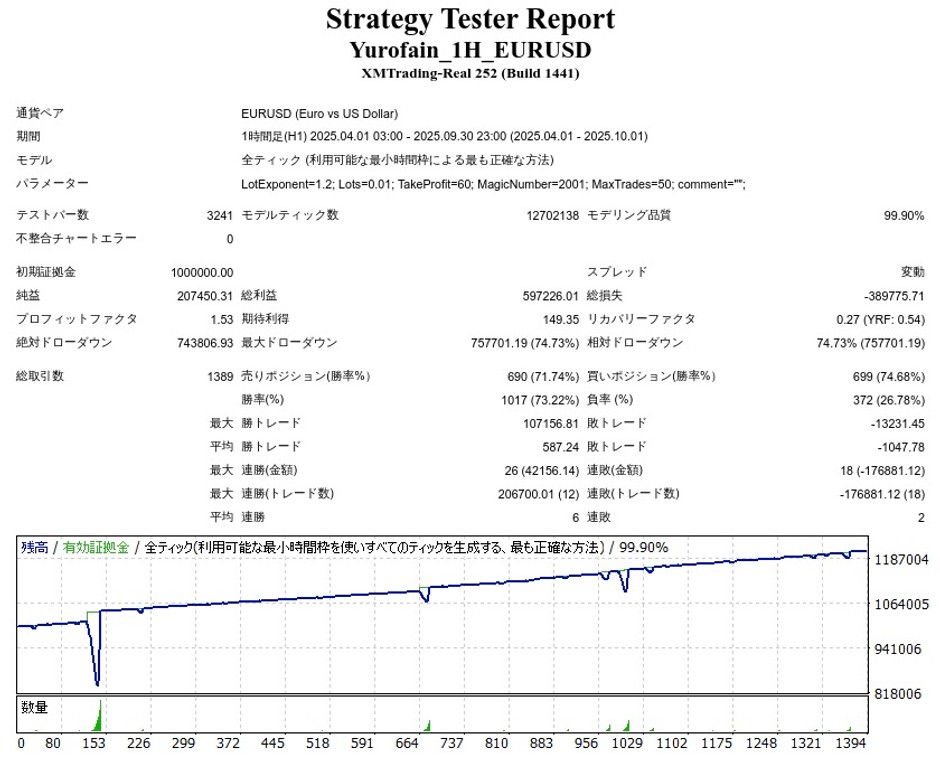 | 初期証拠金 | 1,000,000円 | 勝率 | 72.76% |