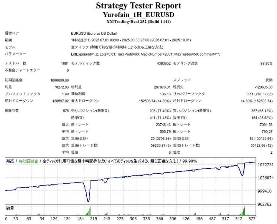ユーロファイン 1H EURUSDのリリース後のバックテスト結果(≒フォワード結果)は以下のようになりました。