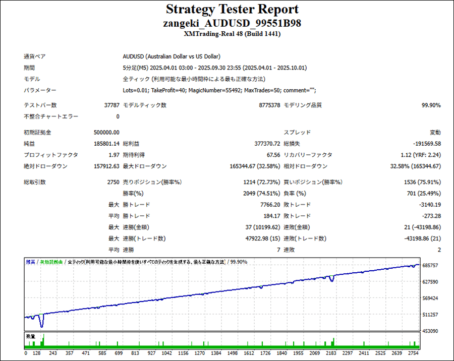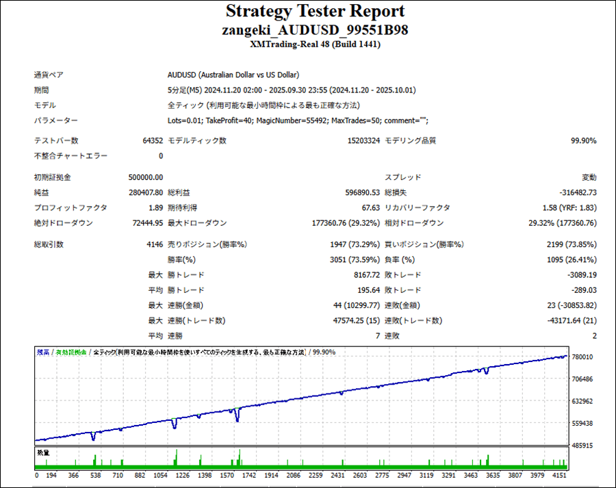 斬撃 AUDUSDのリリース後のバックテスト結果(≒フォワード結果)は以下のようになりました。