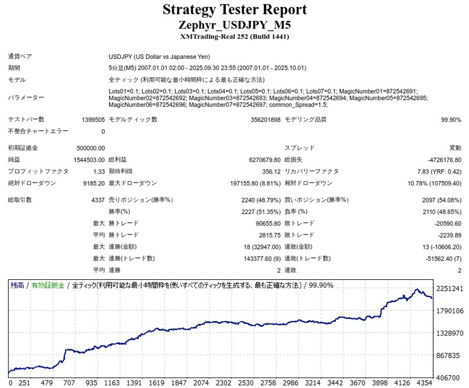変動スプレッドON、スリッページONにして、できるだけリアルに近い環境でテストしています。
