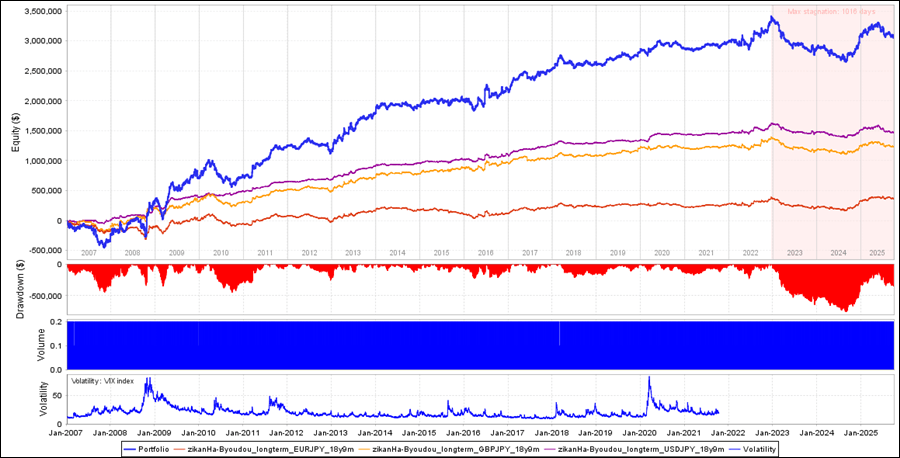 年次成績では、3通貨ペア合計でマイナスだったのは2007年、2012年、2023年、2025年でほかはプラスでした。