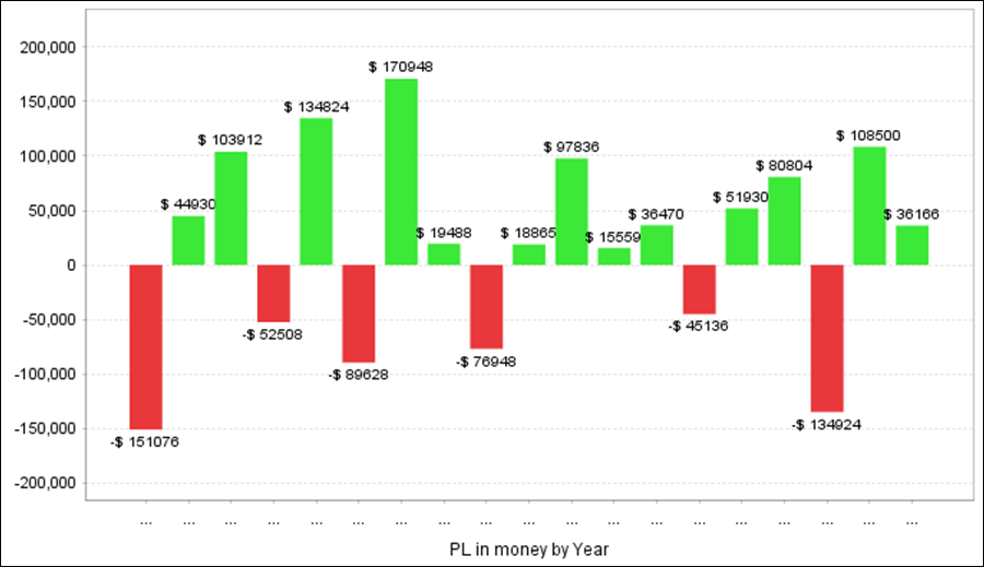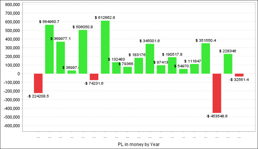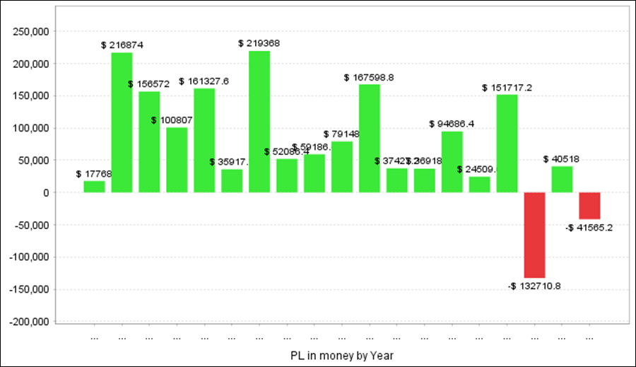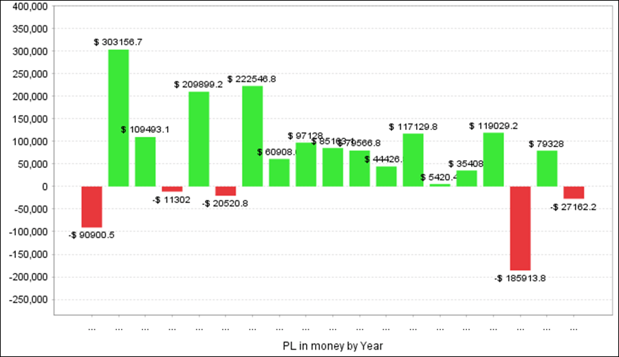 QuantAnalyzerを使って、長期成績がプラスだった3通貨ペアを合計すると、過去18年間で+325.3万円の収益となりました。
