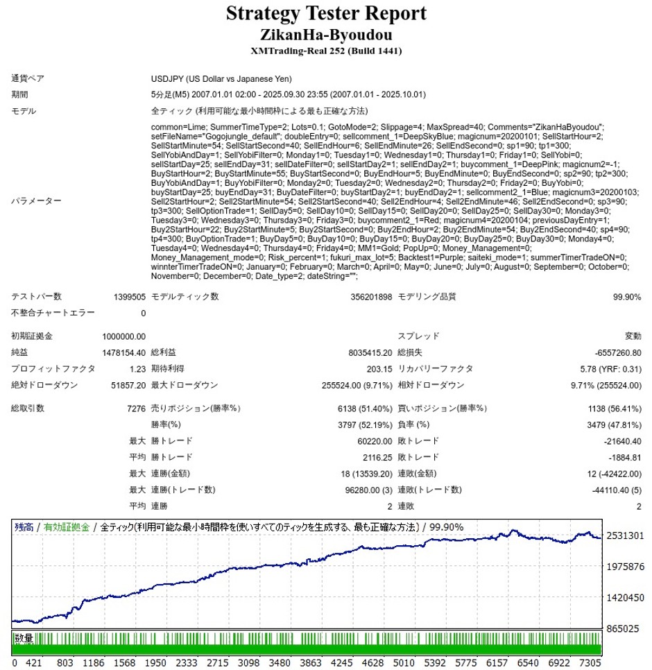 変動スプレッドON、スリッページONにして、できるだけリアルに近い環境でテストしています。